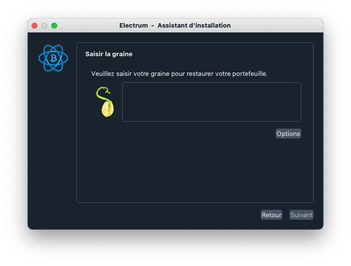 Sur l’écran suivant, saisissez les 12 mots de votre seed Electrum. Veillez à éviter les fautes d’orthographe et à mettre chaque mot à sa place avant de passer à l’étape suivante.