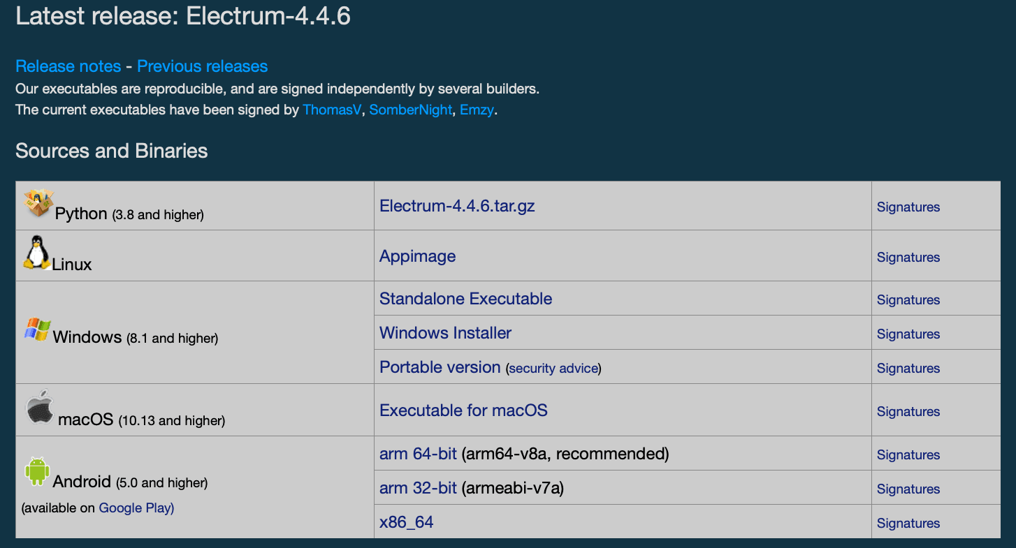À partir de là, vous pouvez choisir de télécharger un wallet Electrum sur macOS, Windows, Linux ou Android.