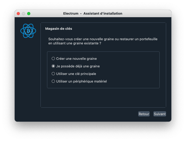 Après avoir choisi le type de wallet que vous voulez, Electrum vous donnera l’option de créer un nouveau wallet ou de restaurer un ancien compte. Cliquez sur le bouton « Je possède déjà une graine » pour récupérer un compte Electrum avec votre phrase de récupération.